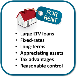 Single-family homes offer an investor the ability to borrow large loan-to-value amounts at fixed interest rates for long terms on appreciating assets, tax advantages and reasonable control. Some of these characteristics are not available through other investments.