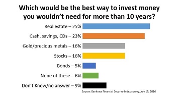 Real estate is the overwhelming preferred choice by Americans as identified in a recent survey. With the Dow Jones industrial average reaching record highs, it might be expected that the stock market would be the favored choice but that wasn’t the outcome.